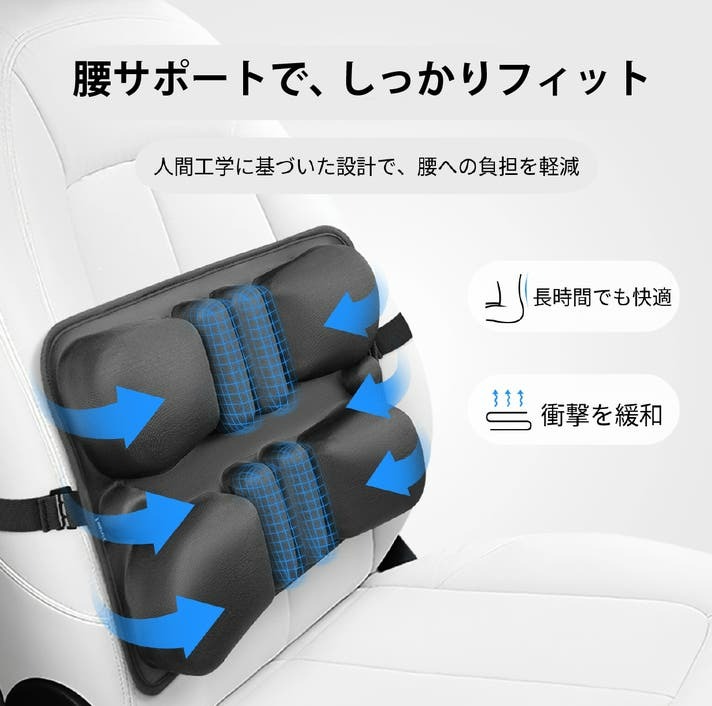 背もたれに置くだけで背中をサポートし、車だけでなくデスクチェアでも活躍します。
